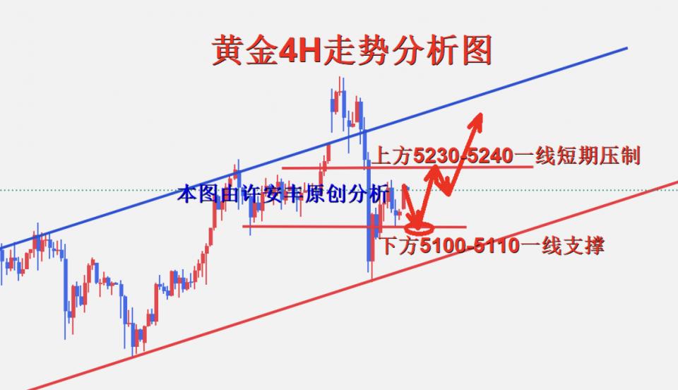从4小时行情走势来看,下方关注5100-5120一线短期支撑,上方关注5230-5240一线短期压制,回撤调整就是给大家进场做多的机会,在明确的趋势前提下,一定要果断把握住进场,操作上以稳健操作回撤做多为主,具体操作策略我会在盘中提示,及时关注。