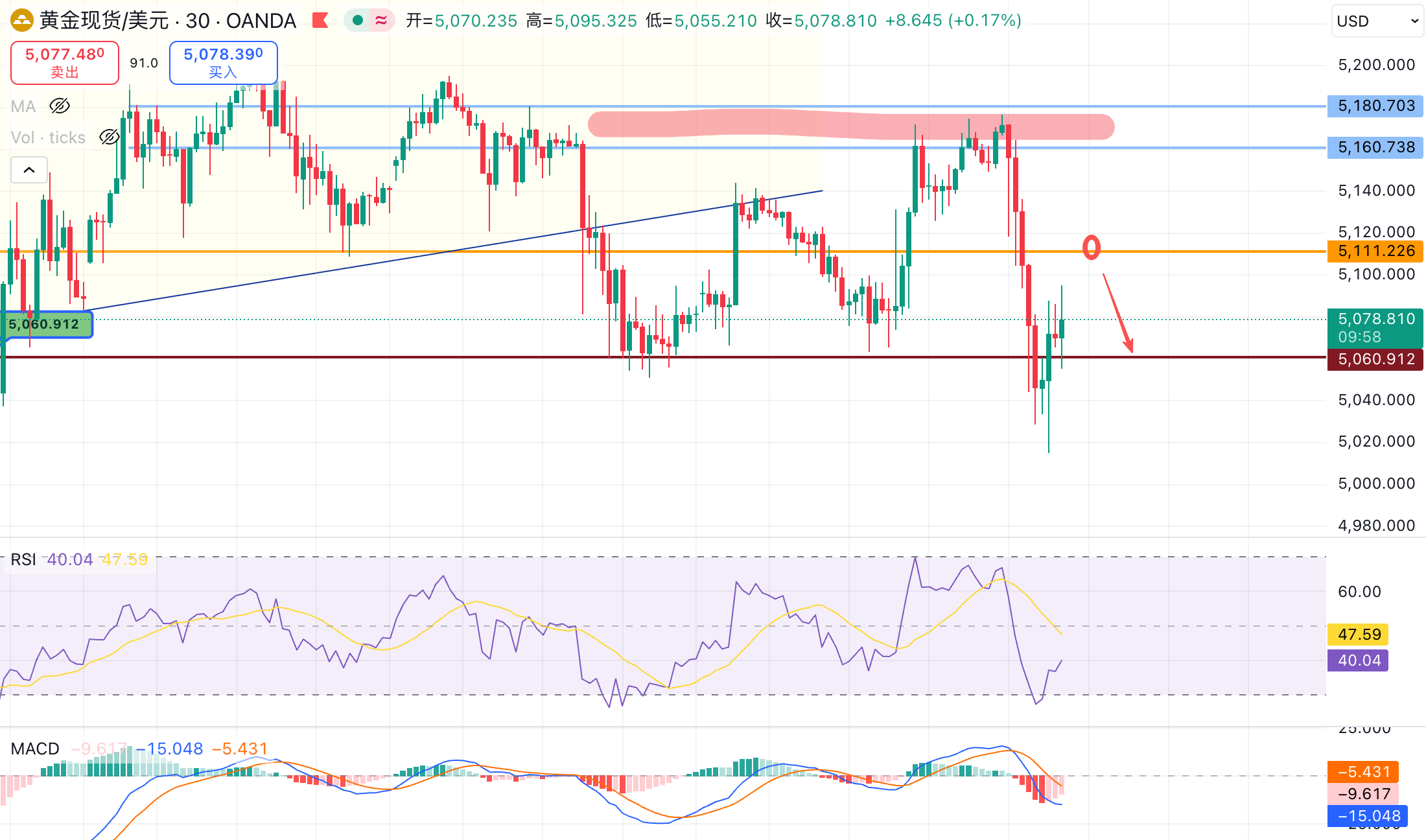 今日(3月9日)亚市早盘,黄金开盘出现快速下探。此前多次强调的5160—80压力区间依然有效,价格在跌破5060支撑后最低触及 5015,随后迅速反弹,目前回到5080一线运行。
