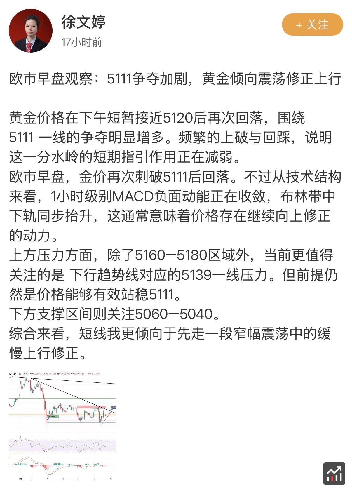 黄金价格在昨晚美盘初段先跌后涨(符合日内分析预期,下图),约4小时后重新站上 5111 分水岭,并在尾盘有效突破下行趋势线,短线结构明显改善。