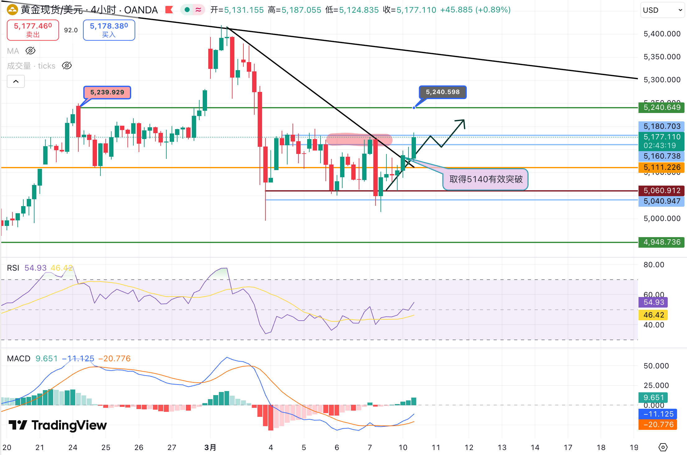 今天(3月10日)早盘低开高走,价格快速突破自上周四以来的 5160–5180 压力区间。随着关键压力被突破,短期多头动能有所增强。