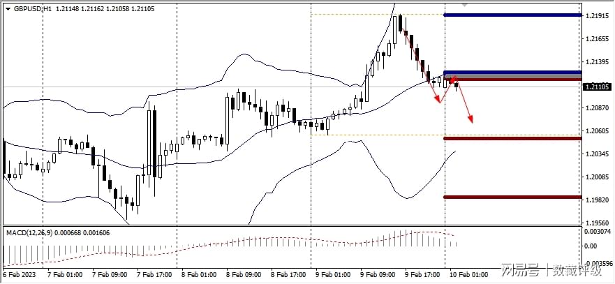 MACD在0轴之下,代表空头意愿强,同时价格运行在布林带中轨下方,预示行情向下的概率大,故而可以采取高抛策略,第一支持位置1.0693,下个目标看向1.0672。