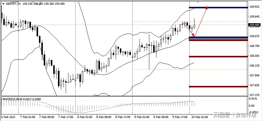 MACD在0轴之上,代表多头意愿强,同时格运行在布林带中轨上方,预示行情向上的概率大,故而可以采取低吸的策略,第一压力位置159.88,下个目标看向160.00。