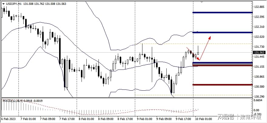MACD在0轴之上,代表多头意愿强,同时价格运行在布林带中轨上方,预示行情向上的概率大,故而可以采取低吸策略,第一压力位置132.20,下个目标看向132.50。