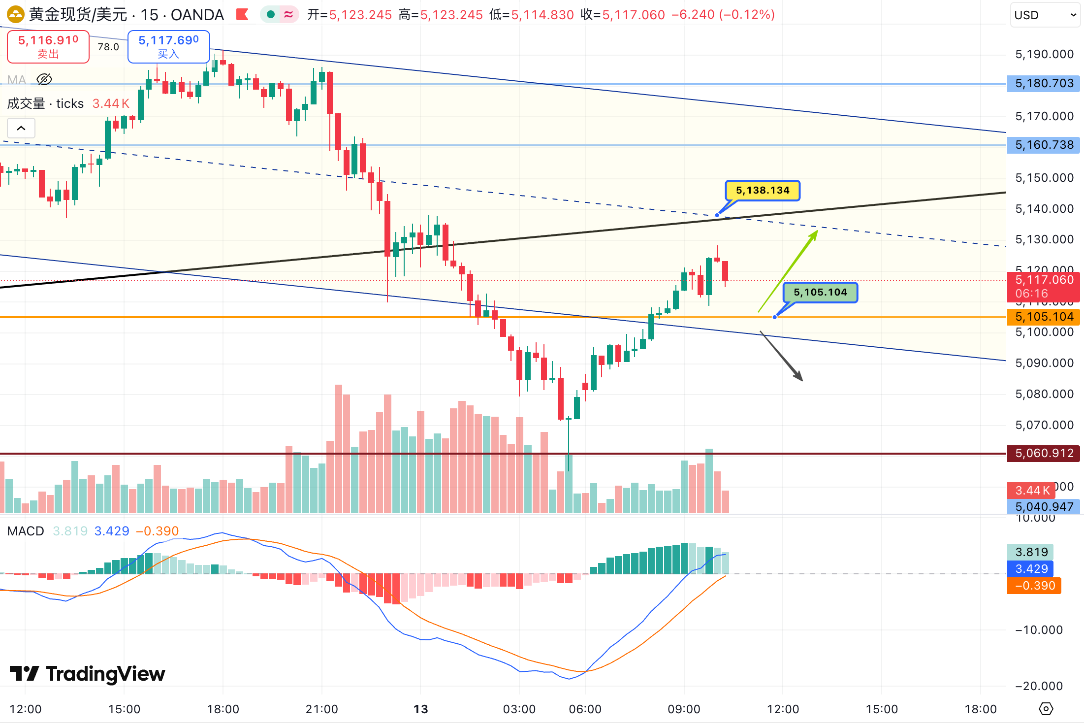 今天(3月12日)早盘,金价出现快速反弹并重新站上 5111,上方需要重点关注 5138 附近的趋势通道中线压力,该位置或成为反弹的重要分水岭。