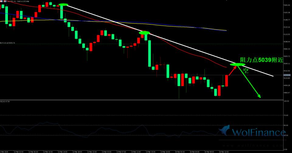 观点逻辑:1. 金价5038附近空单观点, 止损5050, 止盈5000---4960附近 ,跟踪止损300点。