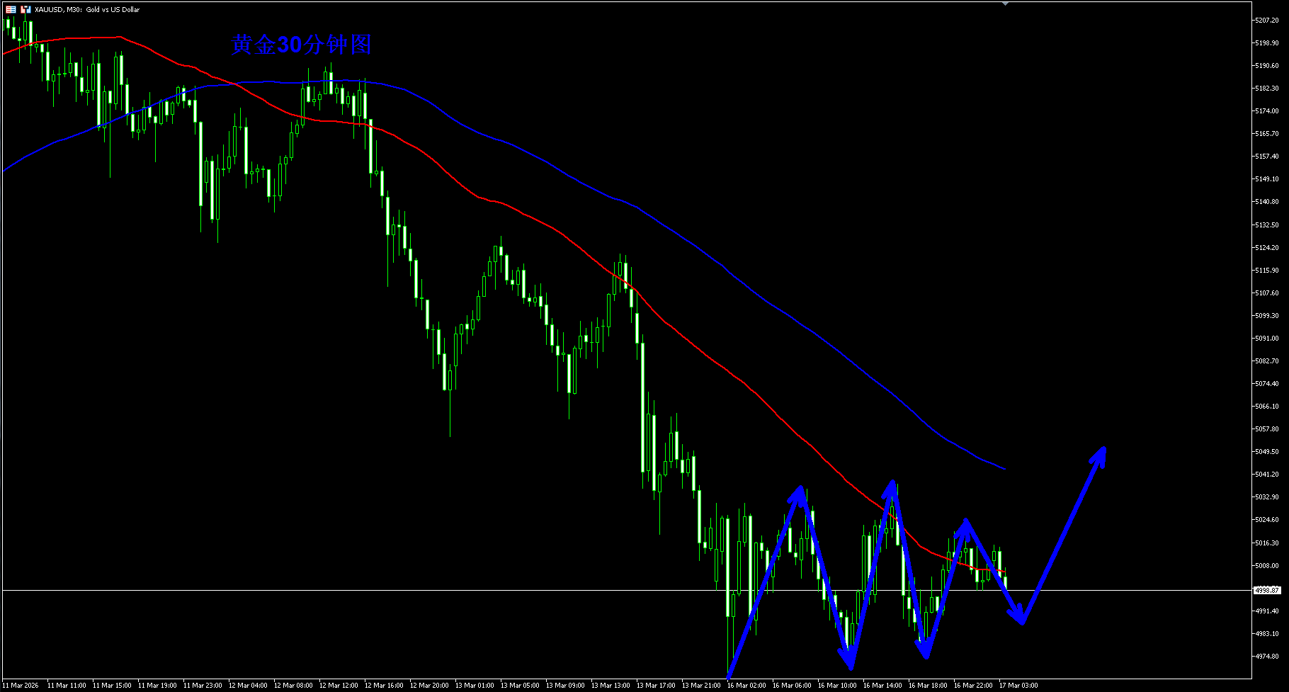 黄金30分钟已经开始构筑三重底部结构,而且低点还开始逐步抬升,黄金30分钟只要在此区间震荡蓄势,那么黄金短线还是将继续蓄势待攻,如果跌破4967区域的低点,黄金可能会进一步下探,不过幅度可能也比较有限,不要轻易去追。