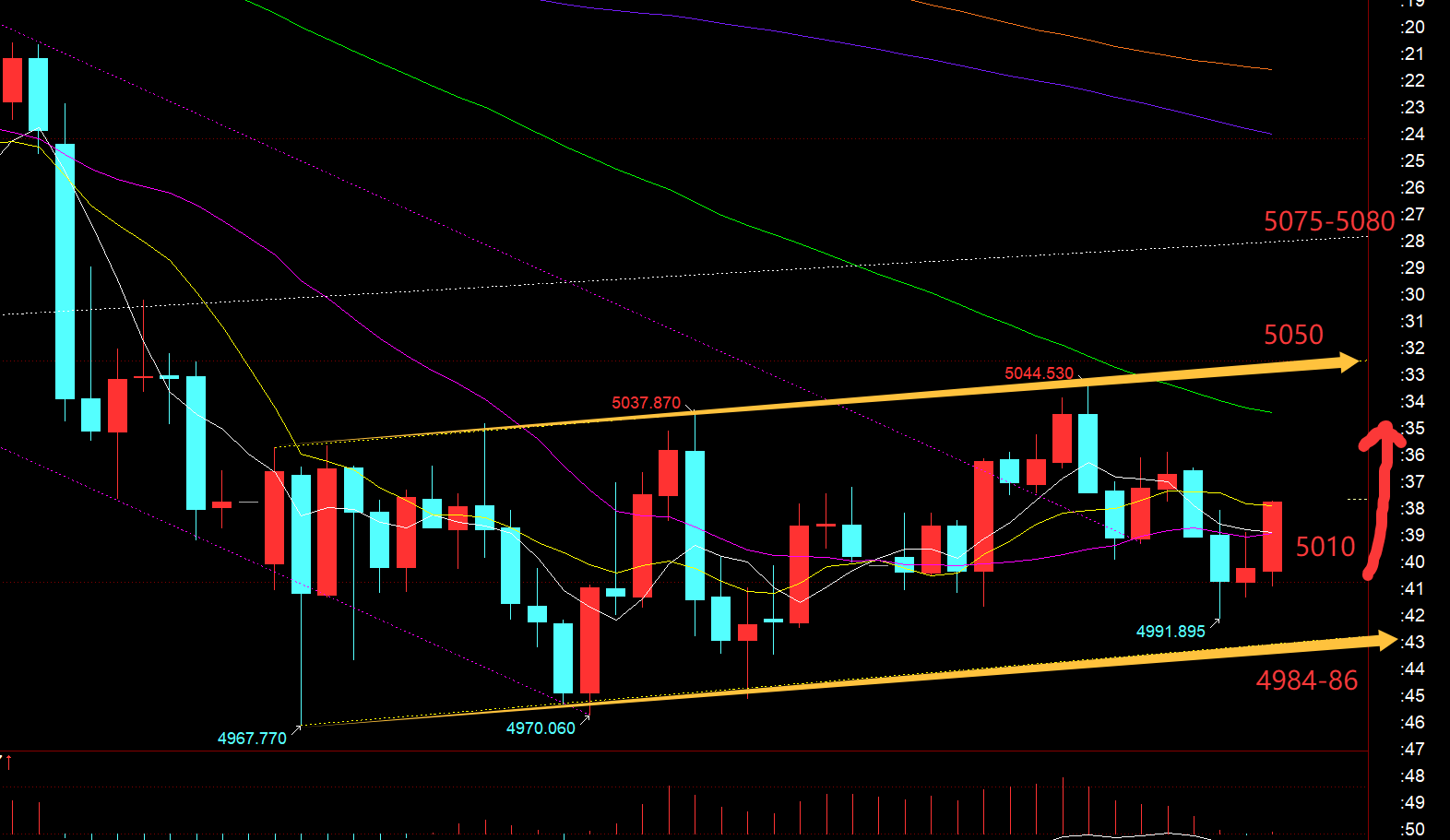第二,黄金小时线级别:今日早间依托4994-95企稳拉升一波,这个位置就基本是隔夜反弹回踩的618分割位置,最高触及5045,击穿前面高点再进行冲高回落,这说明它还要维持底部箱体通道内整理;欧盘期间16点收阳反包前一根阴,这里来了一次小洗盘,看似企稳中轨,最终再打压一波至4991,刺破了日内低点,此时再反弹上攻;这也是震荡行情中,常见的上下刺穿不延续走法;所以,今晚来看,大区间还是围绕黄色箱体通道内,下轨支撑4984-86,上轨阻力5050,上破则留意上周白色通道下轨反压点5075-5080,整体上依旧倾向于震荡走高,待底部整理酝酿完毕后;现在从5分钟突破下滑阻力线来看,也可能未必给得到下轨支撑4984-86,先留意5010一线位置,若稳住它,则可能直接先上行测试阻力位;