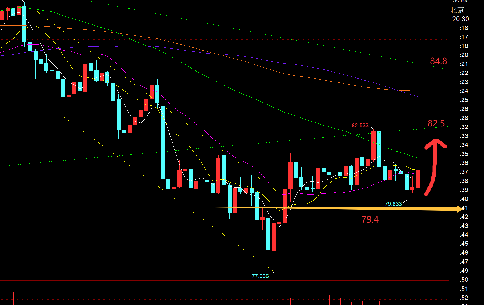 第二,白银方面:77上底部震荡看企稳反弹预判正确,拉升过程中,突破下滑通道之后,回踩确认其上轨支撑点79.4逢低继续北上再次预判正确,今日抵达了82.4反压点;