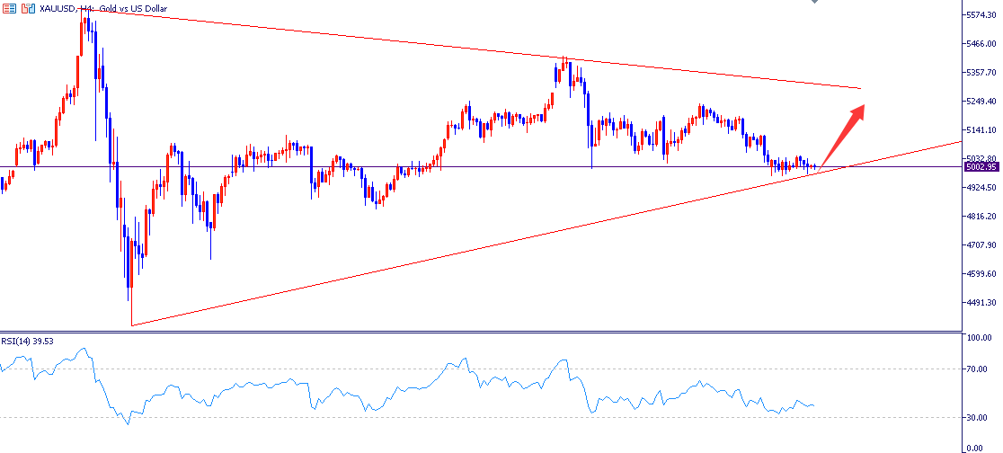 技术面,金价在 4970—5000 区间多次下探企稳,长下影 K 线频现,买盘承接力度增强,4 小时级别底背离信号显现,磨底进入尾声。5000 关口由压力转为多空分水岭,站稳后反弹动能将逐步释放。
