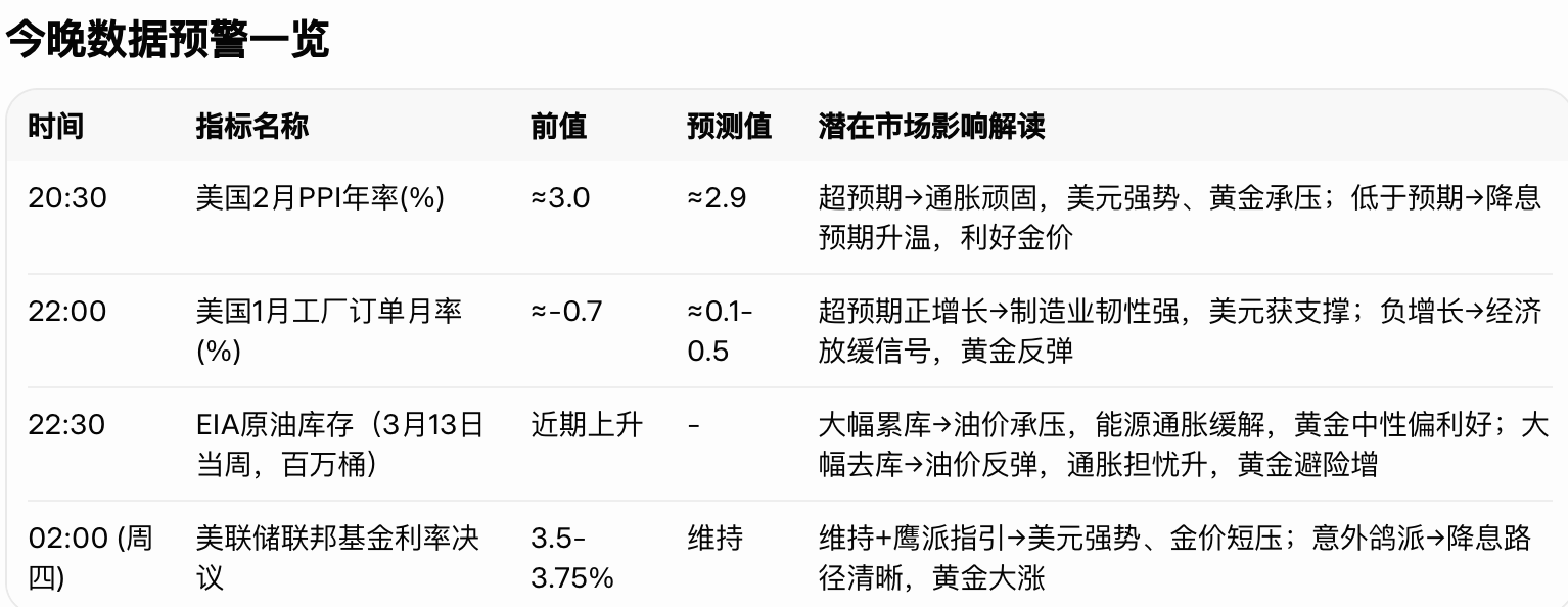 考虑到今晚将公布 美国2月PPI数据 以及 美联储利率决议(下图),市场观望情绪明显,欧盘阶段大概率维持 窄幅震荡,难有趋势性行情。
