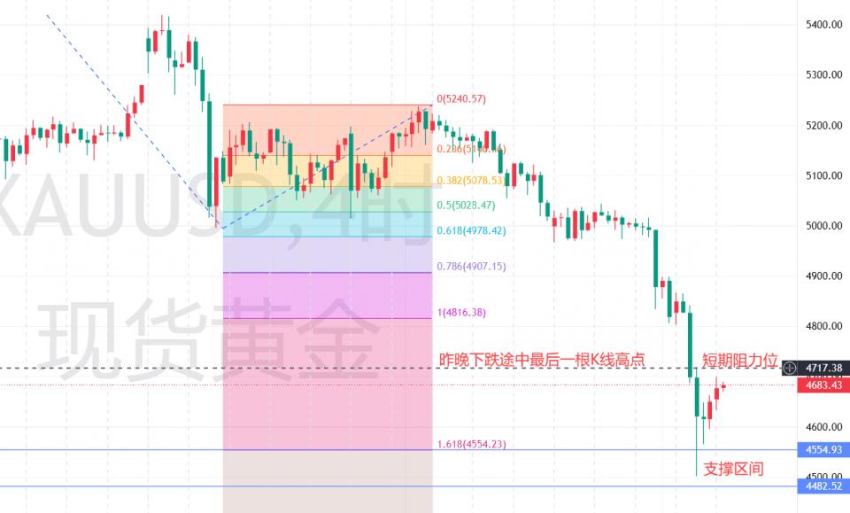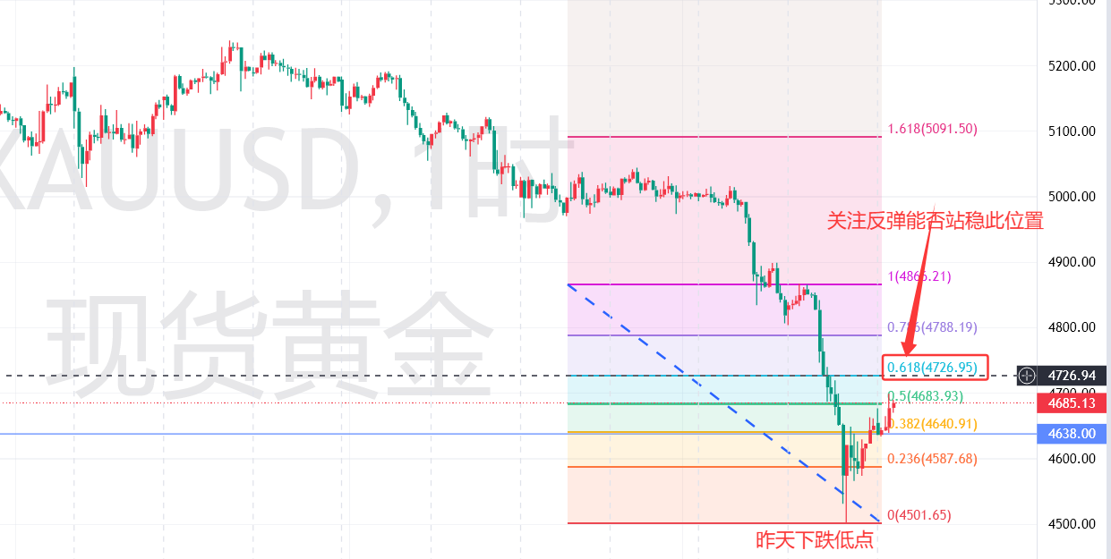 4小时级别:暴跌之后,金价进入低位震荡修复阶段,走势呈现“反弹高点逐步下移”的特征,很明显,空头趋势没有改变,震荡只是为了后续进一步下行蓄力。短期震荡区间锁定在4638-4700美元,这个区间内多空博弈相对平缓,但整体还是空头主导,若能突破4700美元,短期可能会反弹至4750美元附近;但只要跌破4638美元,就会直接下探4600美元关口,甚至进一步延伸。