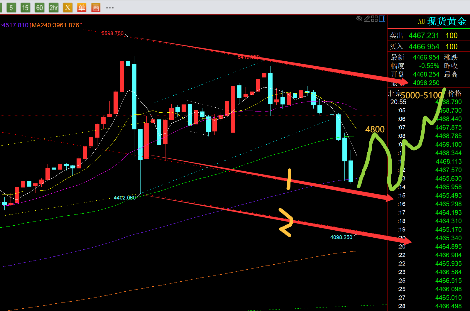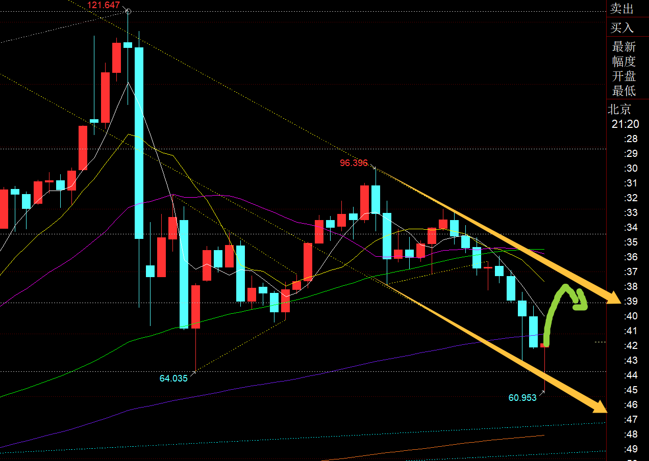 从当前日线形态看,2号通道下轨趋势线基本守住了,今天就看收盘是否处于1号线附近或上方,也就是4400及上,一旦成功,那么会循环5600-4400那一波走法,先延续反弹测试10均线,也会测试5238-4100的618分割处,基本会打到一致,然后承压后再二次下探,这个下探也就是第一波超跌反弹的高点到4100之间回踩的618,基本就是1号线的趋势回踩点,最终稳定它,再震荡一路走高,测试红色通道上轨5000-5100;若承压上轨,那么再回落一波至66日均线,最终会突破红色下行通道的上轨,完成整个上升旗形过程,延续牛市刷历史新高;我相信很多人会不信,这一波的调整的确打压了太多人对牛市的信心,能坚持初衷,坚守下来的没多少人,而市场往往就是少数那20%的人最终会成功;华尔街机构借助这几日持续恐慌断崖式打压,明明已经早超跌了,因为按照原油来对比,它一直未突破站上100关口,美元也未站上100关口,只是处于盘整,黄金早就企稳了,为什么还能疯狂打压至4100低位,就是逼着散户大部分割肉,尤其是打击杠杠的,积存金或实物也被下退或或清场了不少;达到目的之后,就会瞬间超跌反弹,抵达它原本该去的位置;