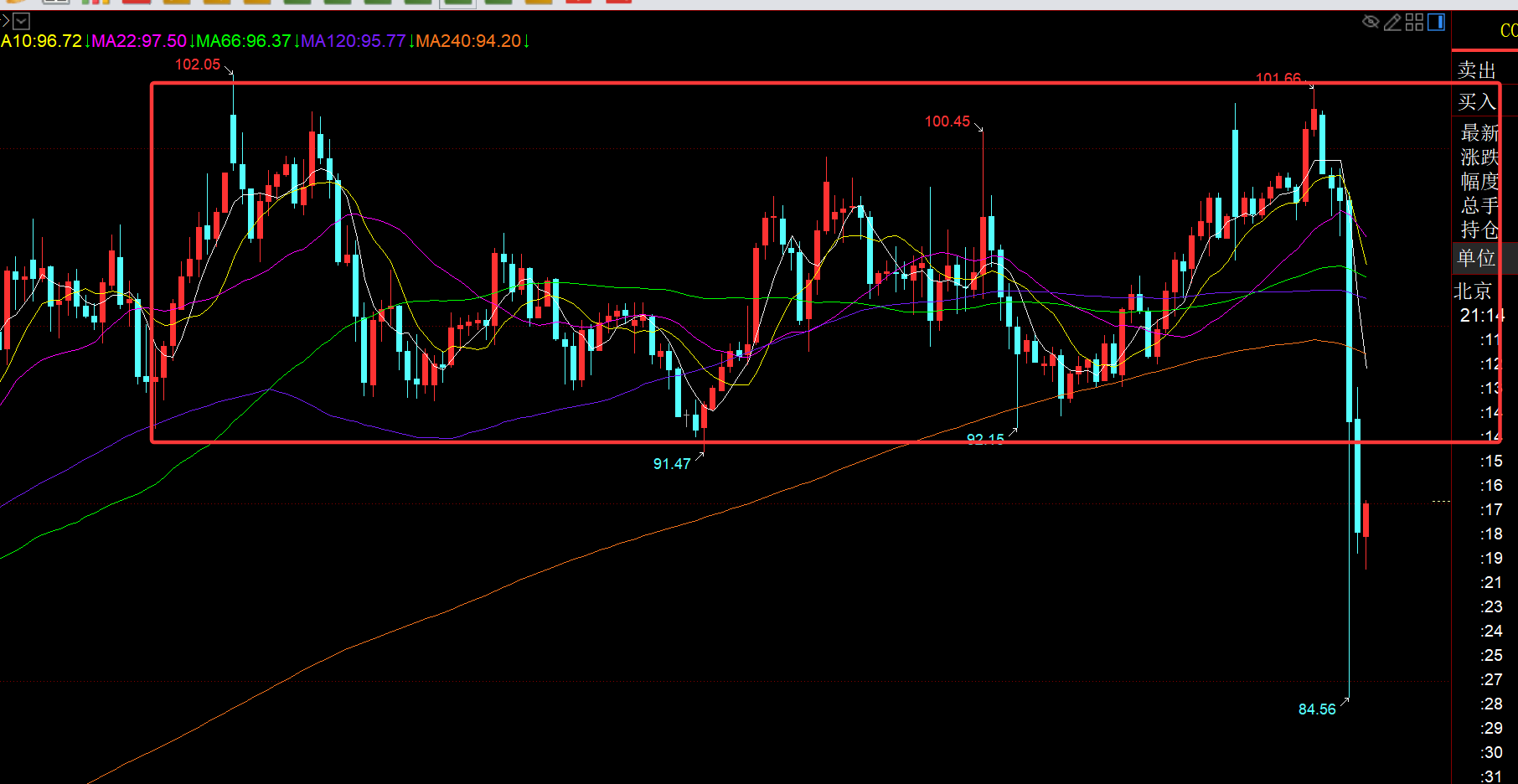 第三,原油方面:已经早提前说过,高位101-92一路横盘,只要站不稳100关口,迟早会冲高回落,只要消息稍微转空,就容易砸盘下跌;今日它来了,那么93及上方会成为顶底压力,今夜无法站上它,无法重回通道之内的话,那么会延续下行;也就是看日线收盘在10日之下能否成功;