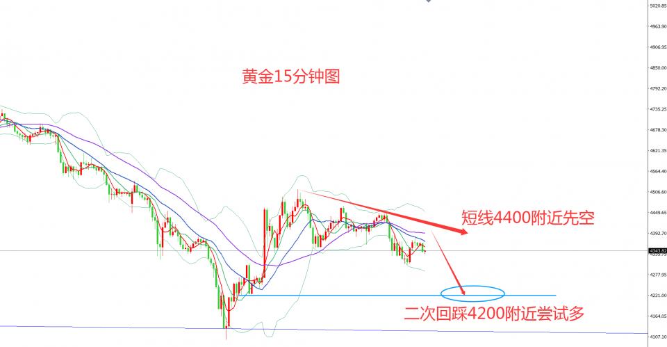 日内,短线还是偏空,二次回踩能不能守住昨天低点,还要看今天欧盘和美盘能否企稳。短线上方压制4400——4430区域,触及此区域可先行短空跟进,目标看4250——4220区域离场。下方支撑区域关注4220——4160区域一旦触及,可尝试做多,防守昨天低点下方。一旦企稳,不破昨天低点,将会开启一波反弹行情,反弹一旦突破昨天反弹高点4506,就会冲击4700——4800附近,届时也是之前套单减亏离场的机会。这是我对本周乃至下周行情节奏的判断。思路仅供参考!