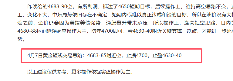 4月7日黄金晚间短线交易:反弹4656附近继续空,止损4672,止盈4610-4600