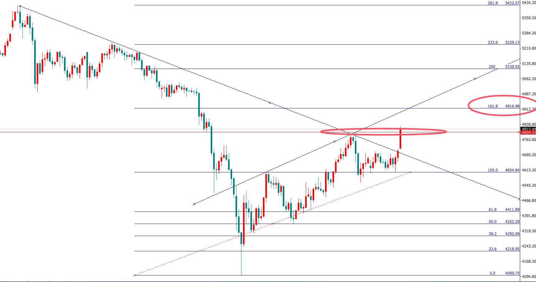 从黄金4小时图来看,此前高点4800已经完全站稳,现在4800已经成为短线多空争夺焦点。在4800之上延续强势格局,如失守4800则当心再掉头。