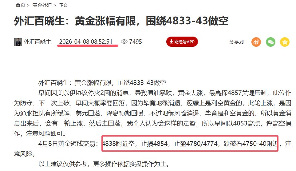 4月8日黄金后续交易思路:短线4838附近空,可以落袋。