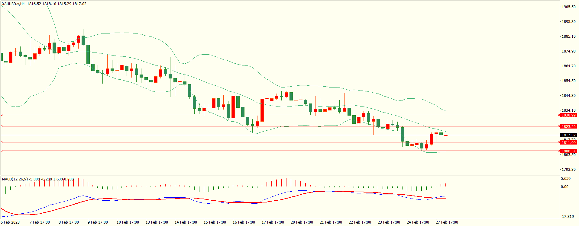 黄金昨日触及前支撑震荡上行,至收盘触及第一阻力承压下行,日线报收上下影线小阳线,从收盘来看,下方支撑犹存,同时上方面临多重阻力,短线将在多空争夺中选择方向,结合4H来看,布林中轨偏下,MACD零轴下方运行,日内下方首要支撑1810-11,第二支撑1805-06,上方阻力1823.1830,第一支撑在没有失守前短线有望测试第一阻力,预防冲高回落。
