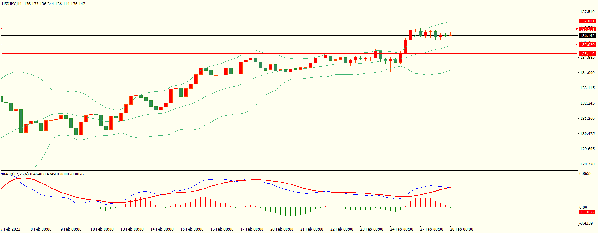 美日昨日波幅受限,基本维持窄幅震荡,日线报收小阴线,上涨略有停顿,短线预防回落,从4H来看,布林上下轨略有收窄,MACD零轴上方运行,日内上方首要阻力136.50,第二阻力137.00,下方支撑135.60,135.10,保持在第一阻力下方短线有望测试第一支撑。