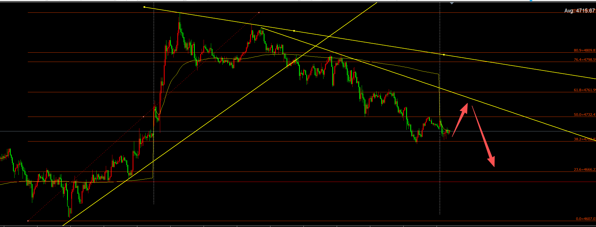 从当前盘面来看,昨天的反弹靠近了四小时的加速线压制,晚间下行也说明了这一点上方压制明显,日图的单K虽然不能说明反弹一步到位,但是至少对于今天想破高的机率不大,第一次下跌50位4732,二次反弹下跌回到0.382位,整体被空头主导,对于今天来看,日图26天线与四小时上线出现重合压制在4787一线,上图的侧压力在中轴4760附近,边线4800这里,而昨晚的反弹连0.618都没过,所以今天预期修正后走四小时的进一步调整,进一步回下线4620区域,所以综合得出结论如下:修正高空为主。