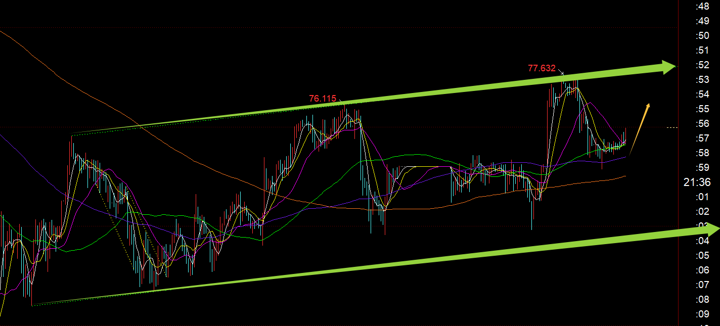 白银同理,也是一个震荡上行通道,守住下轨即可; 今晚74.2上支撑,阻力看75.7-76、77.7;