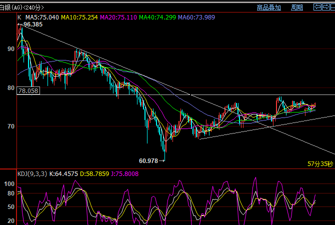 国际白银行情,昨天低开后回升,短线也是偏强;关注测试重点阻力77-78再跌,突破则关注82区域压力再跌。短期支撑明显,5和10日线,重点还是70美元关口。