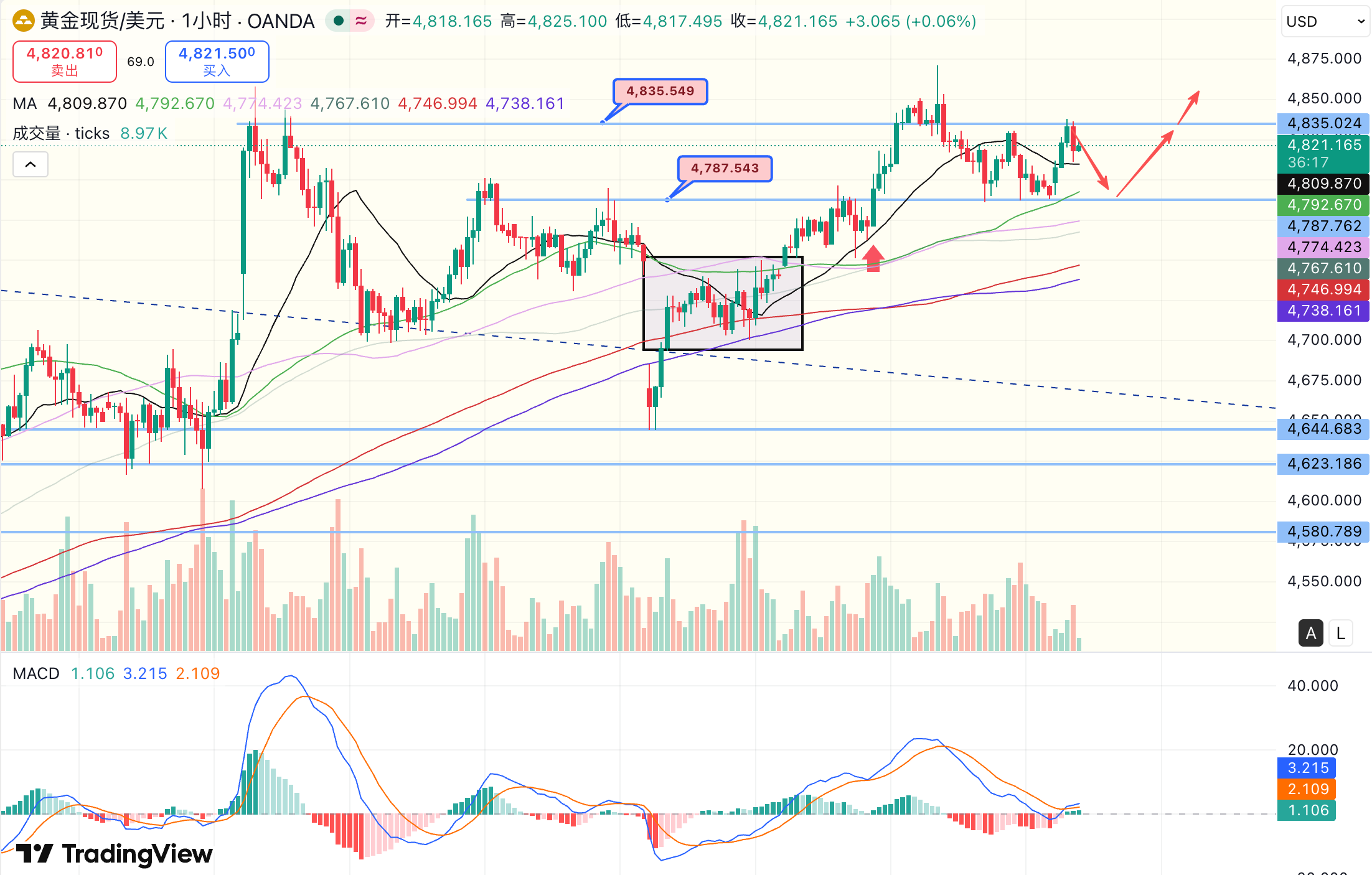 4787这个支撑在昨天得到完美验证,欧美盘中的三次触及帮助小级别均线企稳回升,今天随着1小时60周期移动平均线升上4792,短期行情的震荡区间也较昨日上移,目前周四(16日)亚盘,金价运行于4835-4792区间,从MACD的积极表现来看,价格突破4835只是时间的问题。