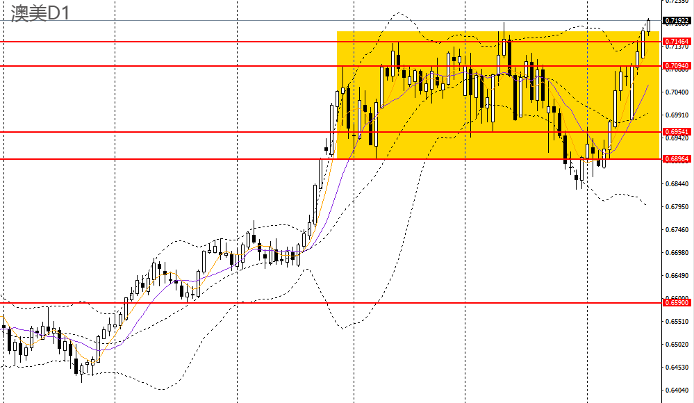 澳美连日走高,创下3年多以来新高,4小时打破此前震荡区间,多单仍可持有,如进一步站上0.72,可看多至0.7240。
