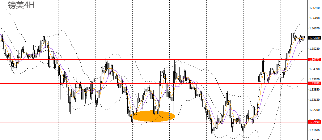 镑美昨日收十字阴线,4小时一度逼近1.36大关,整体走势偏强,1.3540上方可延续低多思路,后市预计将站上1.36,1.3620。