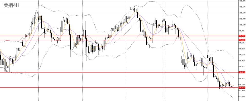 美元指数昨日收十字星,今日亚盘再破前低,4小时彻底失守98关口,后市有望下探97.50-97.70。