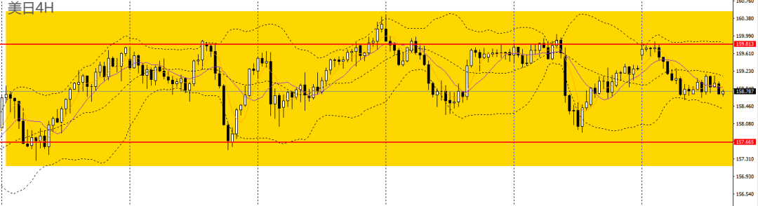 美日昨日小幅回升,5日、10日均线交错粘合,日线RSI位于50附近,4小时仍于158-160区间内震荡,稳健者可保持观望。