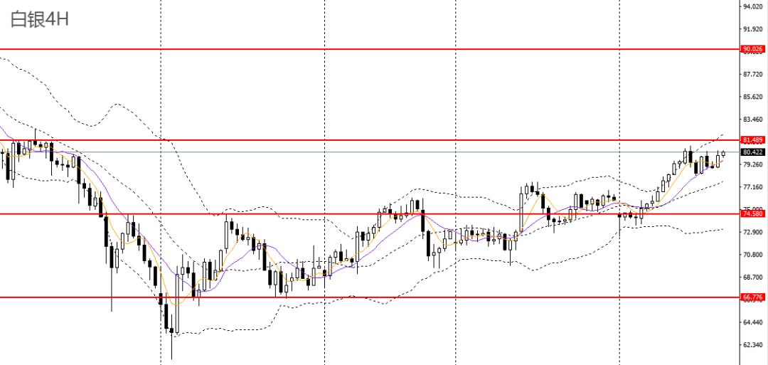 白银昨日收十字星,徘徊于日线布林上轨附近,4小时77-78一带支撑,短线走势仍偏强,可继续上看至81.5一线。