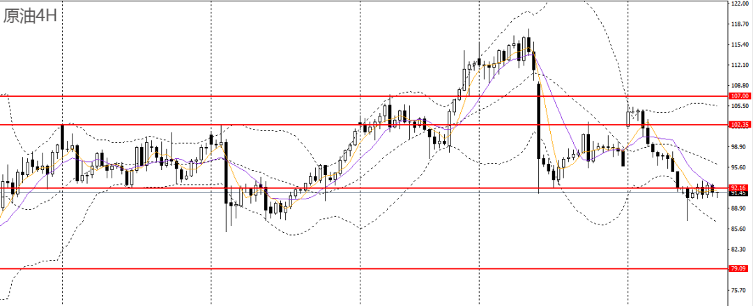美原油周三探底回升,仍承压于5日均线,4小时徘徊于关键节点92附近,如无法有效跌破92,空单可暂时离场。