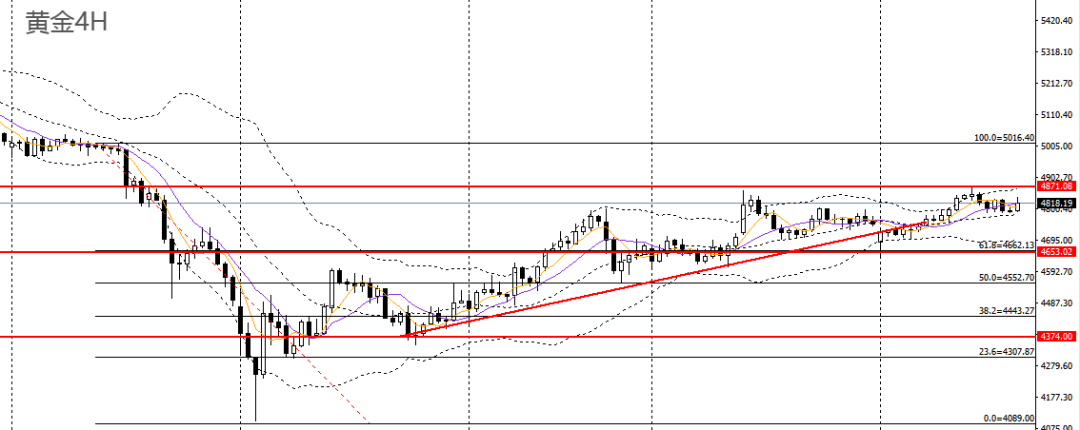 黄金周三小幅收跌,日线RSI位于50左右,4小时多头动能放缓,于4860-4870一带遇阻,高位谨慎做多,稳健者建议观望为主。黄金/人民币可暂时观望。