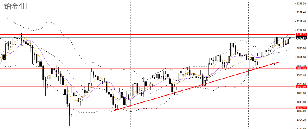 铂金周三收十字阳线,日线RSI位于50之上,4小时上探2150附近阻力,后市有望进一步升破,多单仍可持有。