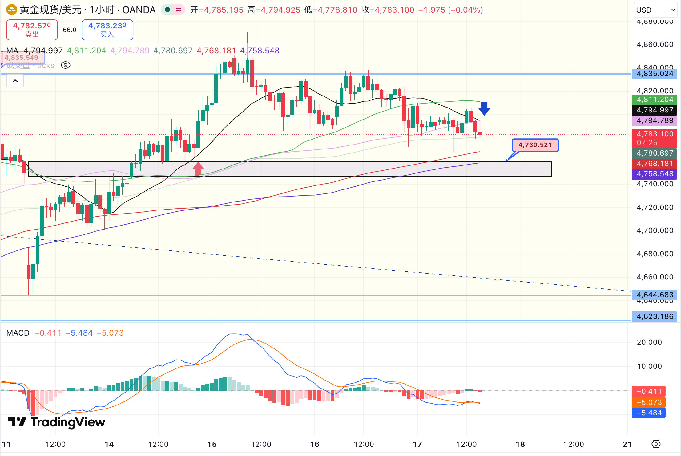 从结构上看,原本关键的4787支撑已失去参考意义,行情重心明显下移。与此同时,1小时级别MACD在弱势区交织向下,空头动能占优,短线仍具备延续回落的条件。