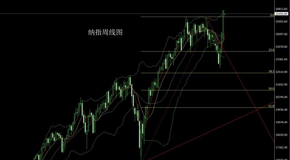 纳指市场上周低开在24816.84的位置后行情先回落,周线最低给到了24749.67的位置后行情强势拉升,周线有效破位前期历史高点26270的压力后周线最高触及到了26726.48的周线高点后行情整理,周线最终收线在了26678.5的位置后,周线以一根略带影线的饱和大阳线收线,而这样的形态收尾后,本周26300多止损26200,目标看26600和26700和26800和26900和27000.