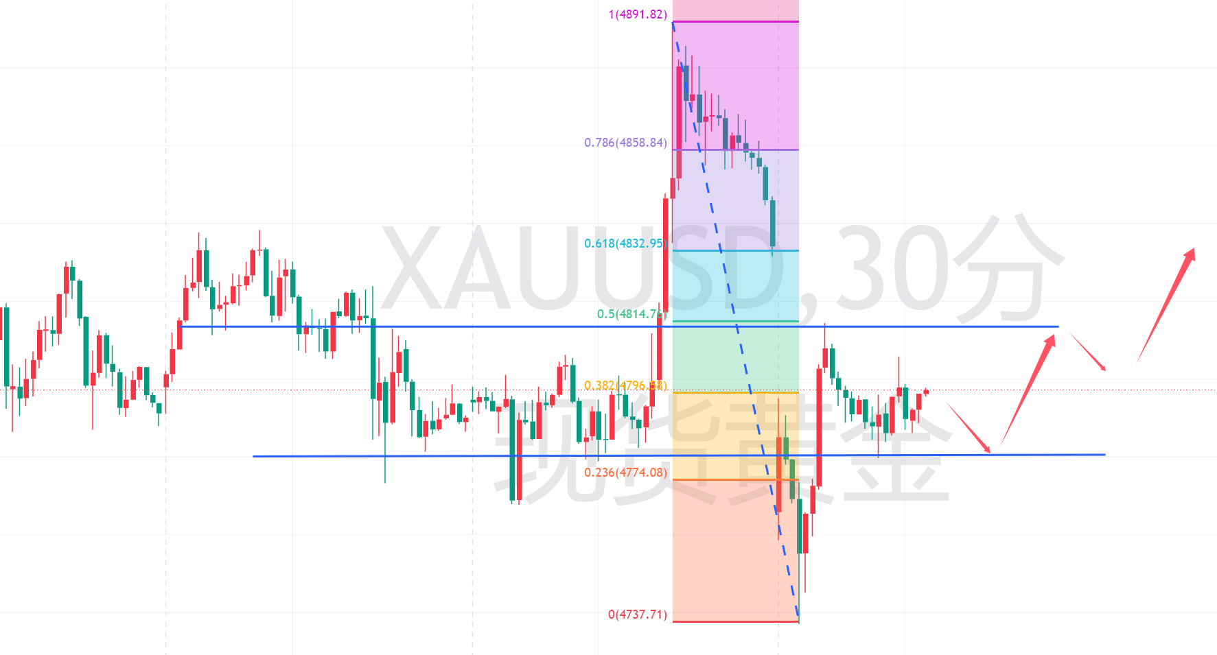 早间一波行情后,就陷入震荡,目前价格还是再4790附近徘徊。别把趋势想复杂,整体还是按照震荡的节奏,区间就是下午给出的图示。618的位置是4832-34,236的位置4772-74。短期操作围绕这个区间进行,中间点位放弃。