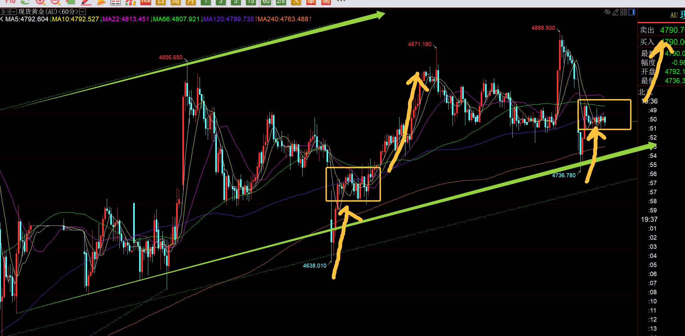 第三,黄金小时线级别:从图中看,绿色通道下轨得到稳定支撑,两大阳探底拉升;随后陷入了窄幅的区间整理,这和上周一基本类似,以日内当前高低点分割来看,382分割支撑是4784.5、而50分割支撑是4775.5, 作为短线V快速上攻走法来看,一般触及这两个分割位置都会存在企稳拉升;4784.5日内触及多次,都有反应;今晚且看能否破日内高点,能上去,就可以试探4830一线,它是上周五高点和今天低点的618分割阻力,首次试探或有压制,或震荡墨迹下,最终突破站上,那么后续又会试探接近4900;因此,今晚依托两个分割支撑继续震荡看上行为主;