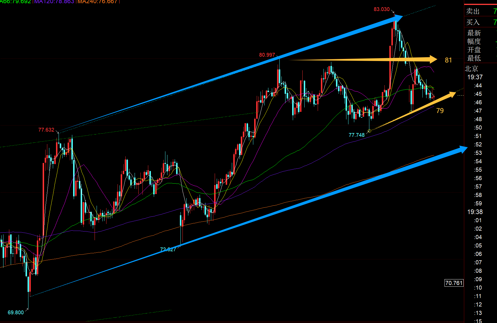 白银方面:从上图看,短期仍处于蓝色上行通道内,今晚留意黄色趋势线支撑,大概79附近,阻力81顶底之下,能稳住79,且向上突破81的话,则可以很快再冲击82-83上周五高点; 短周期macd都酝酿底背离,今晚也倾向于震荡看反弹;