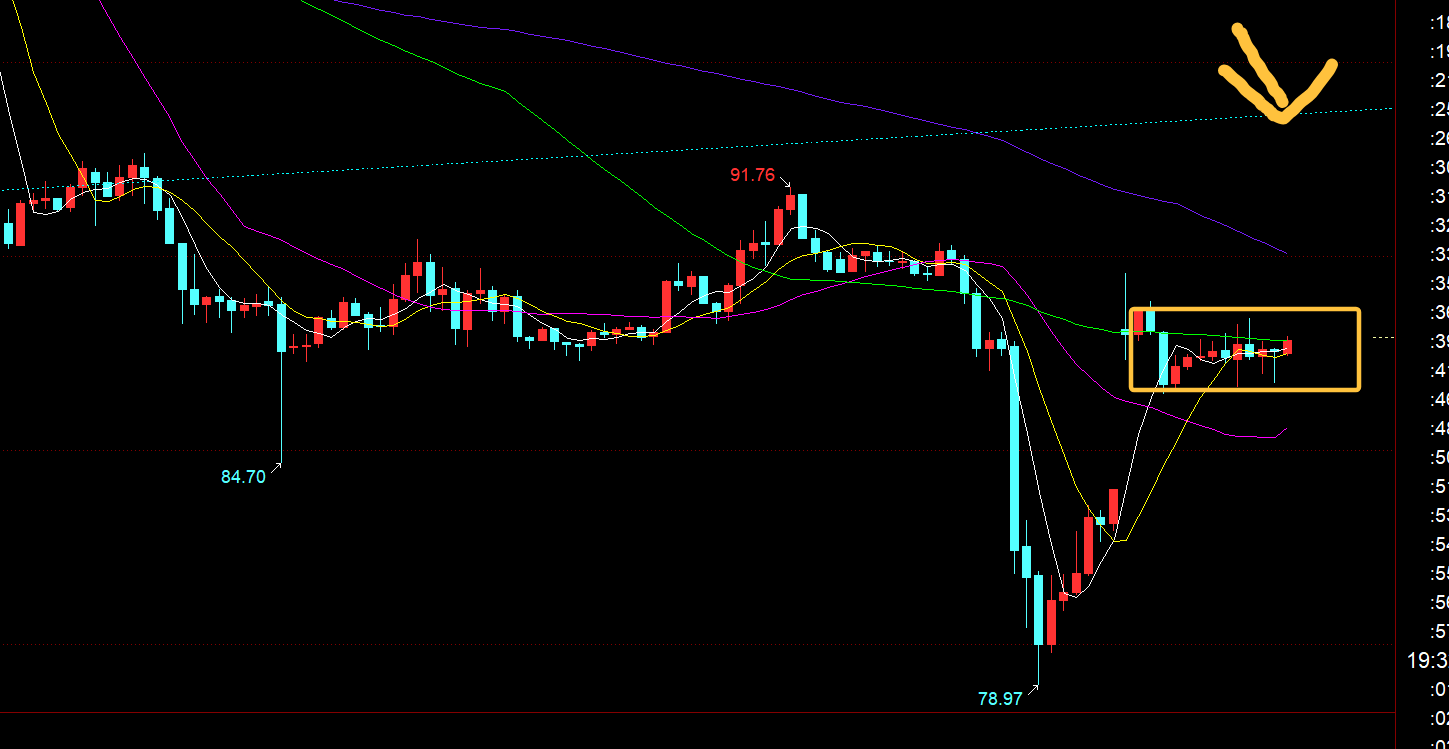原油方面:借助周末消息利多刺激,开盘直接跳开拉升10块,随后也陷入了窄幅的横盘; 上方黄色箭头是前期通道的下轨反压点,这里无法突破站上之前,还是偏反弹对待,并未反转;所以压制就随时会继续下行,回补缺口等;阻力90、93.8之下,支撑84、79等;