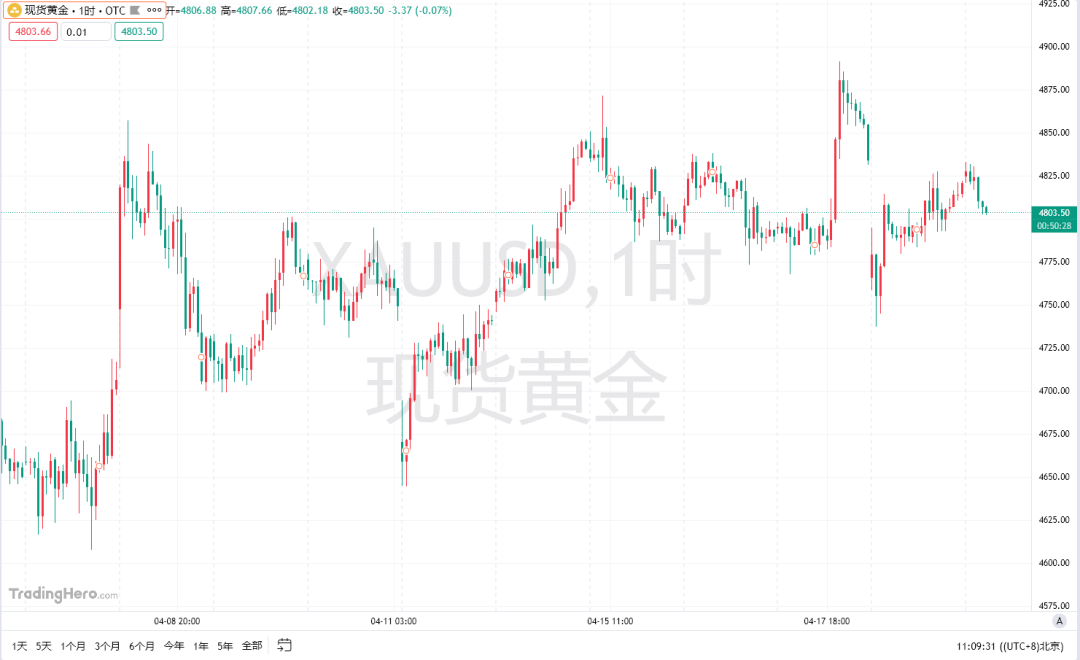 周二(4月20日)亚市早盘,现货黄金开盘微涨后下跌,目前交投于4810美元/盎司附近。昨日4月20日(周一),黄金开盘小幅低开后短暂下行,短期一度失守5日、10日均线,下探至每盎司4737美元,这是自4月13日以来从未见过的低位,但空头动能未能持续释放,价格探底后稳步回弹,最终收报于4820美元,全天的跌幅收窄至约0.28%,日线收出实体阳线,日内走出先抑后扬、震荡攀升的行情格局。