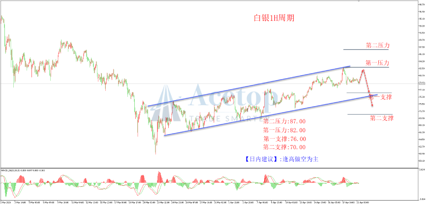从白银1小时周期图看,白银价格在上涨通道结构中运行,短线遇阻上边界压力位回落下跌节奏,目前价格承压82.0美金高位跳水回落节奏,k线下跌力量较强,后市有望继续延续震荡浪回落走势,往下边界支撑位运行。综合MACD指标看,快慢线0轴下方运行,表明空头力量主导行情。策略上建议顺空头趋势浪找压力位埋伏空单思路为主。