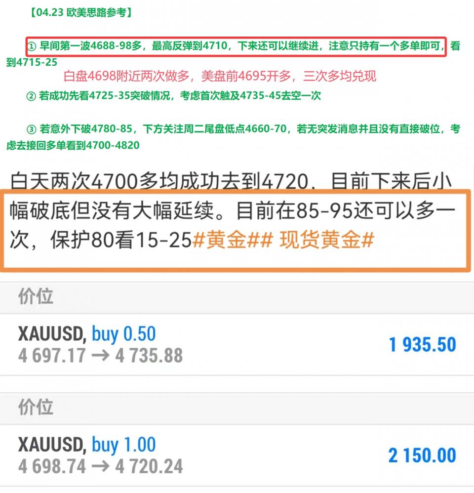 昨日金价走出冲高回落的倒 V 反转,早间最高冲高到4752后快速回落超 50 个点,我们白盘两次给出4690-4700附近做多思路,均成功兑现在4720上方。