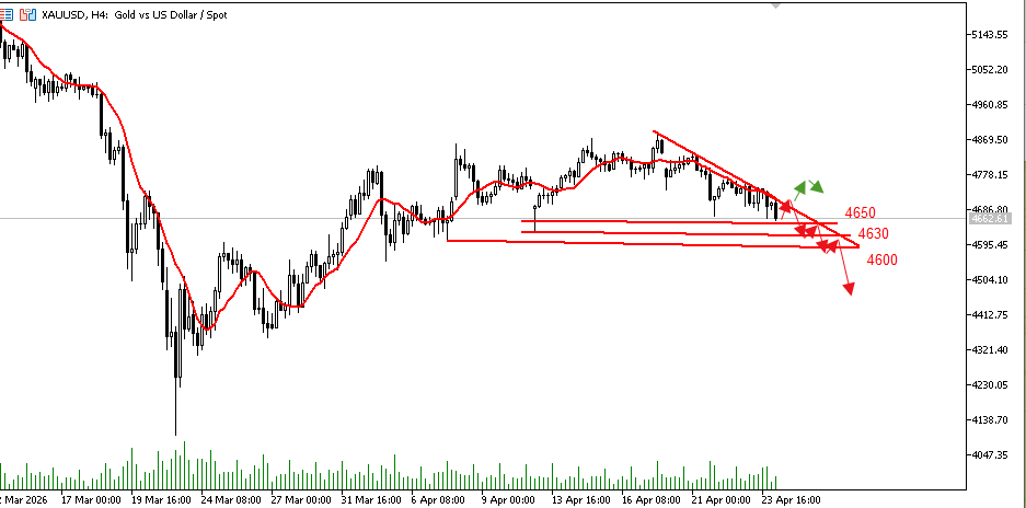 相对强弱指数(RSI)进一步跌入熊市区域,表明卖压不断增加。因此,若跌破4650美元,可能引发进一步下跌,下一个目标位为4600美元。
