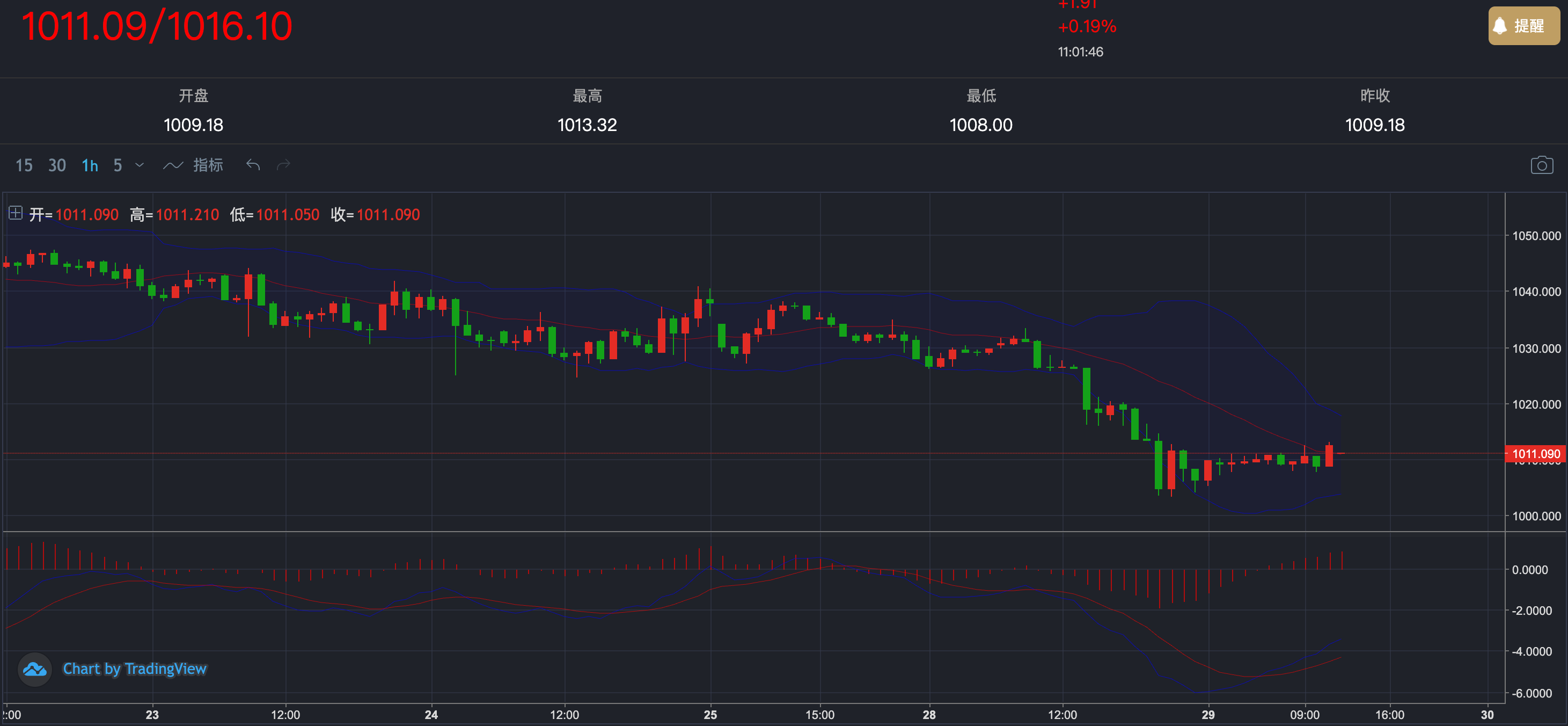 从1小时图看,融通金此前快速下探后,在 1000整数关口 附近获得支撑,昨晚探低后并未出现进一步放量杀跌,反而进入横盘修复节奏,说明空头释放已有所放缓。