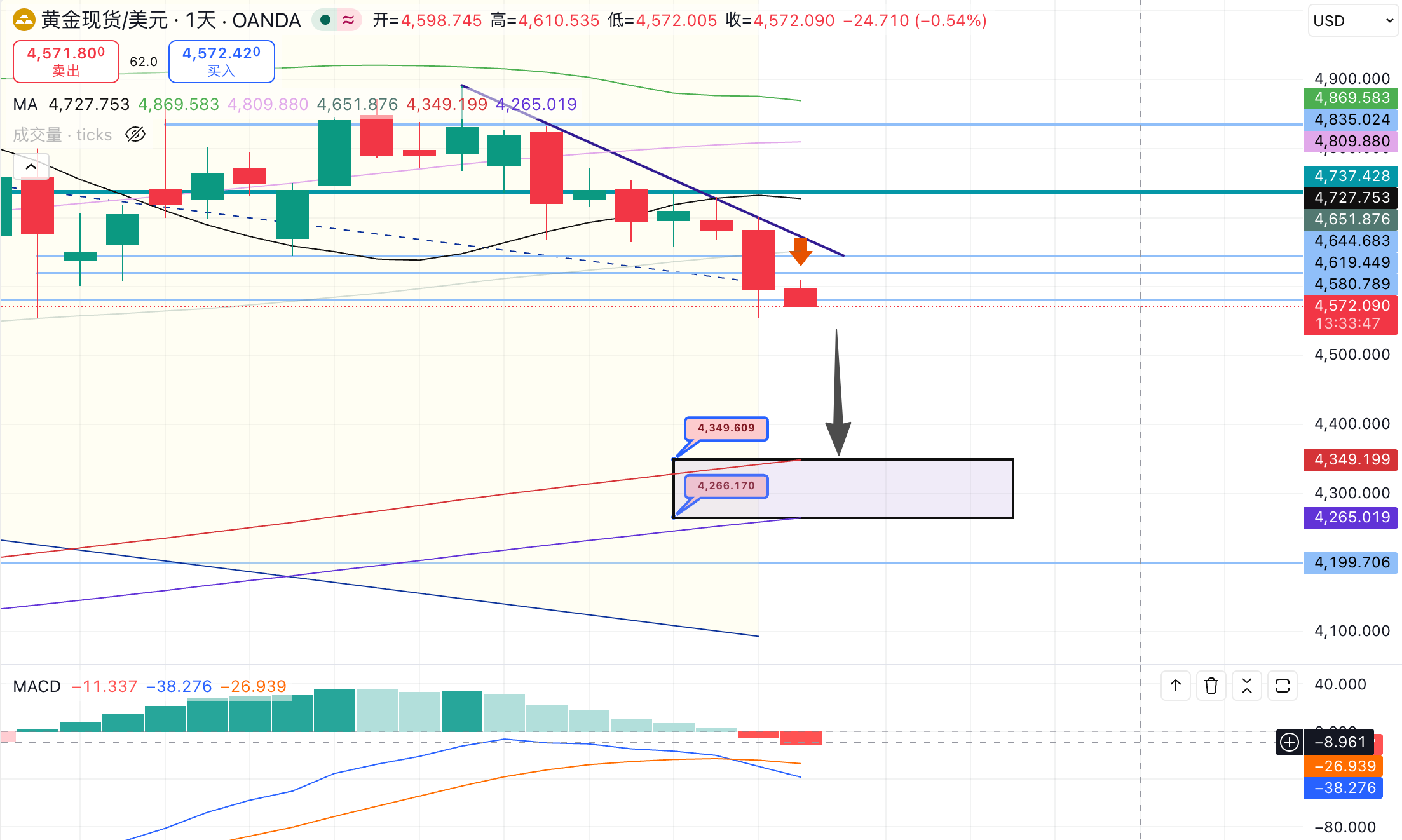 若该位置再次失守,价格大概率会很快跌破亚盘低点 4575,并进一步测试 4560支撑。这里参考的是昨晚美盘前一根1小时关键收线位置,也是当前较重要的短线分水岭。