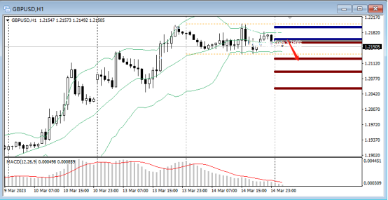 MACD在0轴之下,代表空头意愿强,同时价格运行在布林带中轨下方,预示行情向下的概率大,故而可以采取高抛策略,第一压力位置1.21900,下个目标看向1.21000