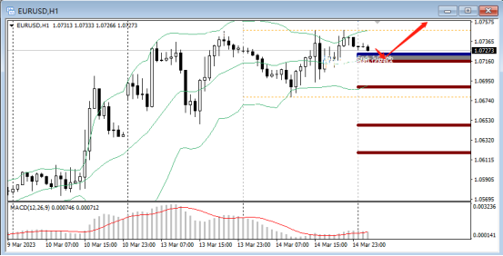 MACD在0轴之上,代表多头意愿强,同时价格运行在布林带中轨上方,预示行情向上的概率大,故而可以采取低多策略,第一支撑位置1.07080,下个目标看向1.07600