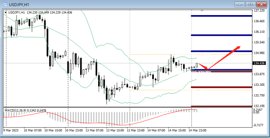 MACD在0轴之上,代表多头意愿强,同时价格运行在布林带中轨上方,预示行情向上的概率大,故而可以采取低多策略,第一支撑位置133.860,下个目标看向135.100